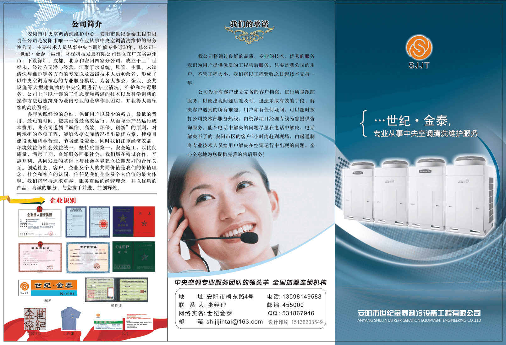 新一代企業(yè)的目標(biāo)是組合各種資源,為社會服務(wù),為社會和大眾創(chuàng)造價值。世紀(jì)金泰(安陽)空調(diào)設(shè)備工程有限公司作為一家年輕的公司,在十幾年的艱苦創(chuàng)業(yè)中,一步一個腳印,在實(shí)干中形成了一種“以質(zhì)取勝,以誠取信”的意識,并將此貫穿在公司各個環(huán)節(jié)的管理和經(jīng)營上,使公司在取得良好的經(jīng)濟(jì)效益的同時,樹立了良好的社會形象。在激烈的市場競爭中,世紀(jì)金泰正是因?yàn)榭煽康馁|(zhì)量和誠實(shí)的信譽(yù),才能站穩(wěn)腳跟,贏得消費(fèi)者,拓展了市場。公司視誠信為立身之本、發(fā)展之基、信譽(yù)之源。公司奉行全方位的誠信理念。企業(yè)、管理者及職工都要講求誠信。不僅公司內(nèi)部要講求誠信,在同社會、客戶和合作者交往中也要講求誠信。誠信集中體現(xiàn)在高標(biāo)準(zhǔn)的職業(yè)道德和商業(yè)道德上。